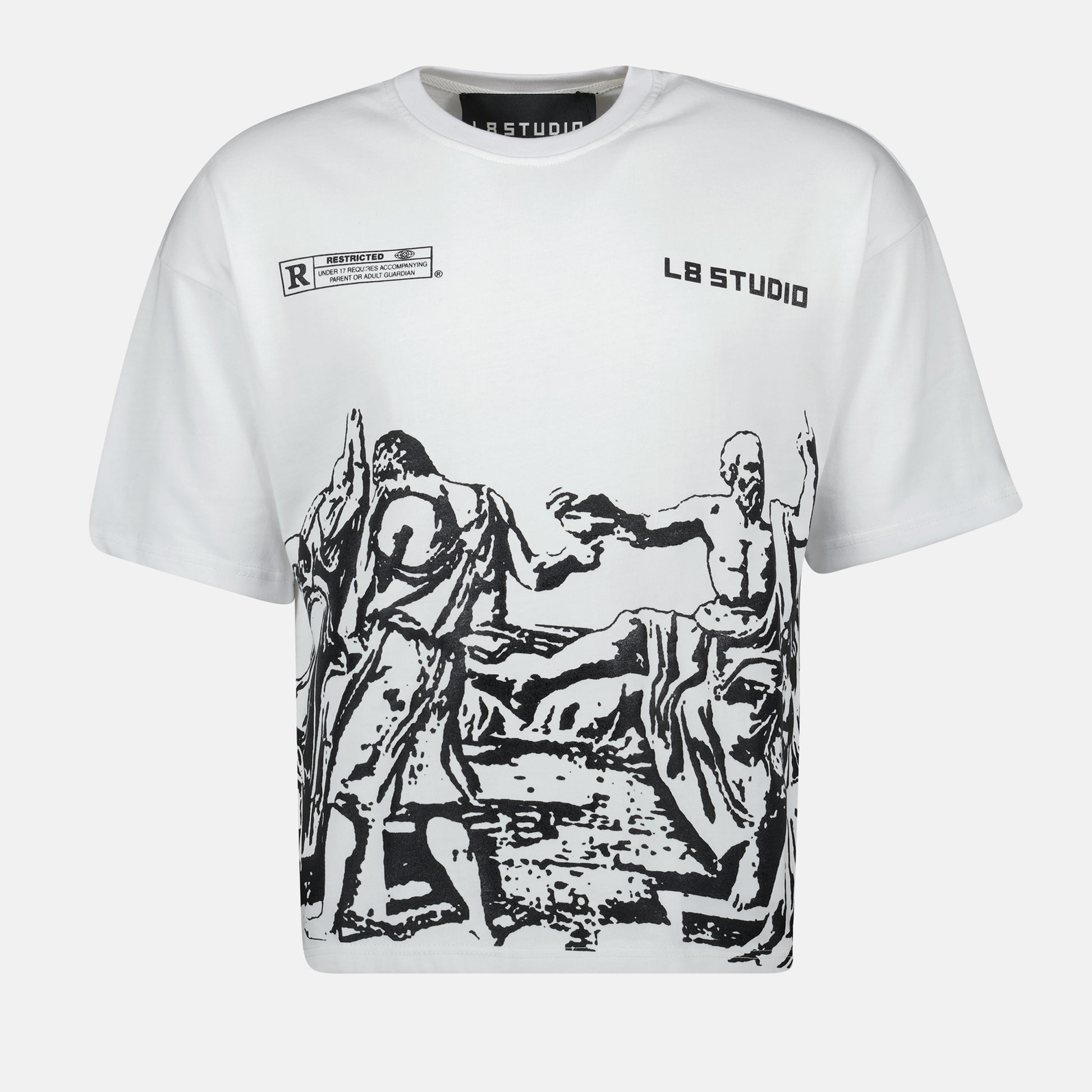 Crafted from premium 300gsm organic cotton, with an oversize fit, this t-shirt exemplifies quality and sophistication. The silkscreen print captures the profound imagery of The Last Scene of Socrates, a timeless depiction of philosophy, sacrifice, and intellectual legacy.